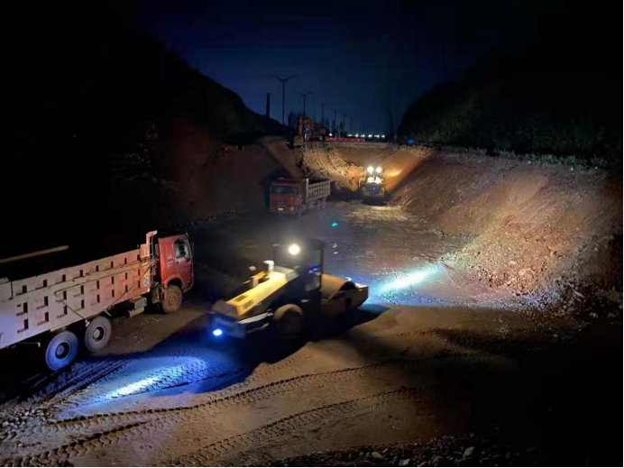 汝陽項(xiàng)目四號(hào)坑夜晚加班填筑碾壓